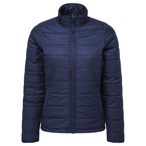 Women’s padded zip-through jacket with horizontal stitching to form baffles, ensuring an even distribution of insulation. Covered zip with chin guard and zip guard to the inner. Styled with a cadet collar. Two welt jet zipped side pockets with a single open pocket to the inner for handy storage. Elasticated cuffs measuring one inch wide. Full embroidery access to the entire jacket through an internal zip in the lining. Lightweight and folds downs easily into its own stuff sack. Made with 100% certified recycled fabrics.