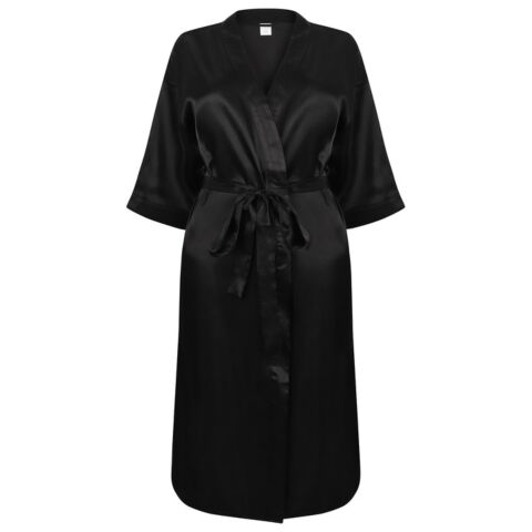 Ladies satin robe. Kimono styling with 3/4 sleeves. Below the knee length. Side pockets. Self-fabric tie belt.