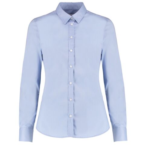 Fused stand-up collar. Two darts at the back. Two bust darts to the front. Rounded hem. Back yoke. Adjustable cuff with buttoned cuff placket. Spare button. Kustom Kit® woven back neck label.